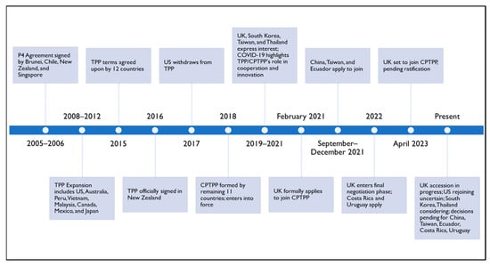 Starting with tangible opportunities, the TPP/CPTPP undeniably provides significant advantages to member countries. It strengthens economic ties and promotes a rule-based order, echoing the principles of liberal institutionalism. By fostering such a stable and cooperative environment, the agreement might counterbalance the growing influence of China [7,8]. The incorporation of environmental regulations and renewable energy initiatives exemplify its commitment to sustainable development, which allows the agreement to strike a harmonious balance between economic growth and ecological conservation [73,74]. Moreover, the inclusion of digital trade provisions serves as a testament to the agreement’s foresight, facilitating the growth of the digital economy and the free exchange of innovative ideas across borders [77,78].