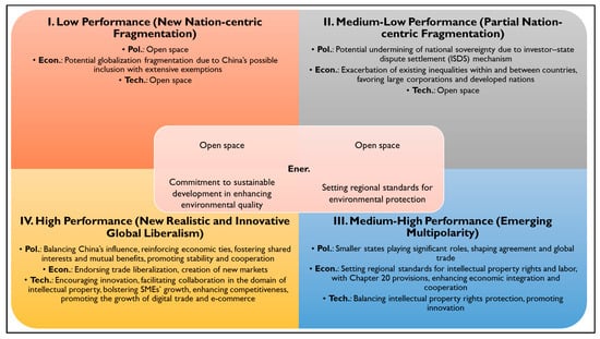 However, as noted in the matrix, the TPP/CPTPP’s influence seems most resonant with the “medium-high performance” scenario. Under this paradigm, smaller states, often overshadowed in traditional power dynamics, gain prominence in shaping global trade agreements. The CPTPP, through its provisions, has laid down standards for intellectual property rights, labor, and environmental safeguards that lean towards protecting both economic and ecological interests [77,78]. This direction is emblematic of a world where multiple influential actors emerge, breaking the historic bipolarity or unipolarity.