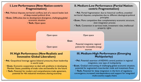 Historical conflicts and unsettled territorial disputes cited by Das [82] and Dent [79] reflect challenges in political structures, potentially contributing to the low-performance scenario. Additionally, Wignaraja [83] highlights contentious negotiations in services trade, investment rules, and intellectual property rights. Such challenges could result in outcomes that are of medium-to-low significance concerning the evolution of the new globalization. However, the emphasis of Vlados et al. [10] on the emerging multipolarity within the RCEP agreement showcases an assertive ASEAN’s central position due to this economic alliance, favoring the medium-high performance scenario.