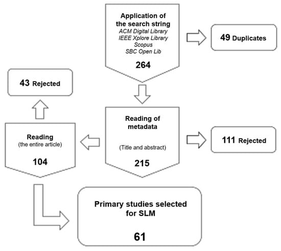 Given the stages involved in the SLM and its specific activities, employing a computational tool is crucial for enhancing quality. In this study, the Parsifal software version 2.2.0 was utilized, which not only aids in systematizing a review or mapping but also facilitates data sharing and online collaborative work. This software (https://parsif.al/ (accessed on 3 December 2022) was employed during the planning and execution stages, proving invaluable in organizing the activities undertaken and, primarily, in categorizing the works extracted from the databases, thereby contributing to the enhancement of the quality of the results. The subsequent section provides a detailed account of the main steps undertaken in this SLM.