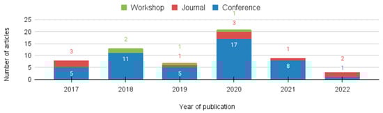 With regard to the types of publication venues, namely whether the articles were published in journals, conferences, or workshops, the results indicated that 47 out of the 61 studies were published in conferences (as shown in Figure 4). Except for 2018, every year at least one article was published in a journal. Additionally, in 2017, 2021, and 2022, no studies were published in workshops. This finding highlights the importance of researchers in the field of computing attaching to conferences as a platform for disseminating their work [].