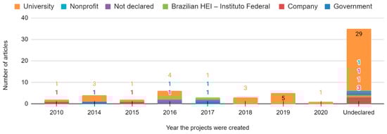 Regarding the year the projects were established, most studies (35) did not report when the projects were created. The analysis of the 26 studies that disclosed this information revealed a quite even distribution over the years. For example, 2016 was the year in which more initiatives were created, with only six. The importance of universities is noteworthy for the institutions from which these projects originated. These institutions were at the origin of 48 out of the 61 projects portrayed in the studies (78.7%). Figure 7 details the project’s years of creation and origins.