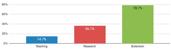 The data revealed that among the projects, 9 focused on teaching, 22 on research, and 48 on extension (Figure 8). The total percentage exceeded 100% because 26 projects operated in two areas, though none encompassed all three. Extension activities, particularly community engagement involving universities and schools, were most prevalent.