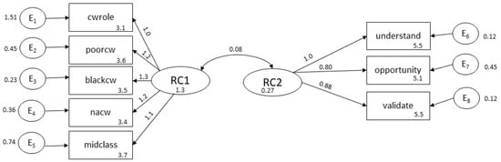 In the next phase of the project, the research team administered the scale to n = 380 practitioners across a large Southern state who enrolled in a Child Welfare Academy to provide training on recognizing and addressing racial and class biases in child welfare. A CFA using a structural equation measurement model was conducted. Figure 1 displays the final CFA model with factor loadings and coefficients. All five items from the EFA significantly loaded onto Factor 1, and all three items from the EFA significantly loaded onto Factor 2. Model fit was adequate, with an RMSEA of 0.06, a CFI of 0.98, and a SRMR of 0.03.
