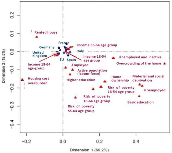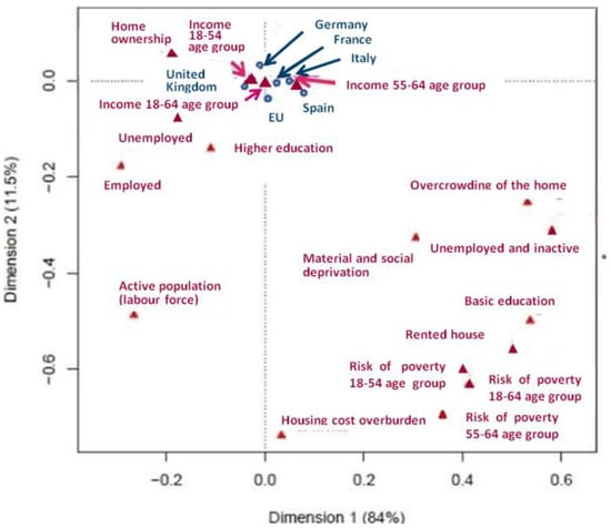 As for the horizontal axis, on the one hand, it points out the housing inadequacy of those who came from other countries and had a low level of education, or personal or family limitations that distanced them from the labor market, especially in Italy and, to a lesser extent, in France. On the other hand, in the United Kingdom and Germany, most immigrants had work from which they derived sufficient resources to live without particular deprivation, and were more active in the labor market, committing themselves to seeking work if, temporarily, they were not employed, so their inclusion in the inactive segment of the population was very limited.