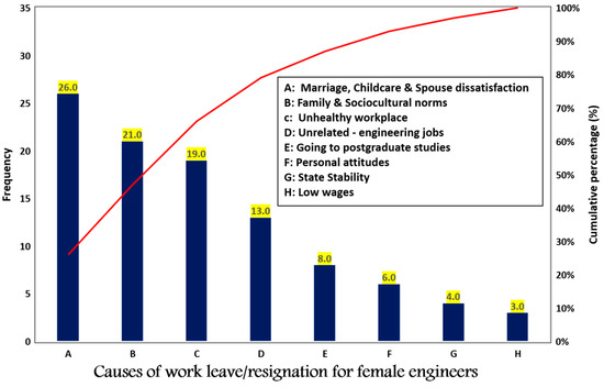 Pareto chart illustrating the causes of work leave or resignation for female engineers based on the employed female engineer respondents.