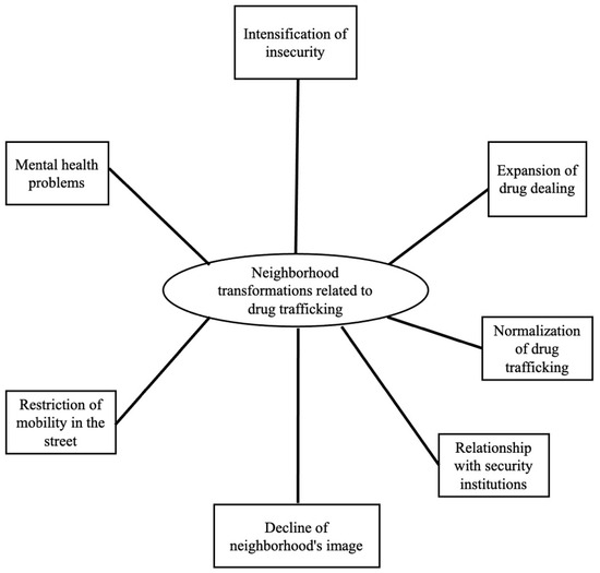 This section presents the categories that represent the main changes generated by drug trafficking in the neighborhoods from the perspective of young people (Figure 1). The testimonies exemplify various categories and sub-categories found in the study. The main changes identified were as follows: the intensification of insecurity, the expansion of drug dealing, the emergence of mental health problems (especially related to addictions), the normalization of drug trafficking, the restriction of mobility on the street, changes in the relationship with security institutions, and the decline of the neighborhood’s image.