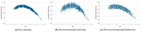 Figure 2a–c graphically display the age-adjusted trajectories for the three dependent variables, as estimated by the quadratic models presented in Table 5. All three dimensions exhibit a clear inverted U-shape, though with varying intensity. Eco-anxiety peaks between ages 40 and 50 and then progressively declines in old age. Environmental activism remains consistently high through midlife, with a milder inflection point, while pro-environmental behavior shows a sharper decline beginning around age 60. These visual representations reinforce the interpretation that age acts as a key moderating factor—not only in linear terms, but especially through its curvilinear dimension, as captured by the regression models.