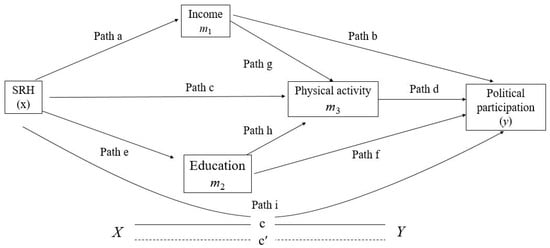 Parallel model of serial mediation to determine the mediating effect of Income, Education, and Physical Activity in the association between SRH and PP. Path (a) = association between independent variable SRH (X) with Income mediator (M1), Path (b) = association between Income mediator (M1) with dependent variable PP (Y), Path (c) = association between independent variable SRH (X) with PA mediator (M3), Path (d) = association between PA mediator (M3) with dependent variable PP (Y), Path (e) = association between independent variable SRH (X) with Education mediator (M2), Path (f) = association between Education mediator (M2) with dependent variable PP (Y), Path (g) = association between Income mediator (M1) with mediator PA (M3), Path (h) = association between Education mediator (M2) with mediator PA (M3), and Path (i) represents c′ = direct effect (X − Y).