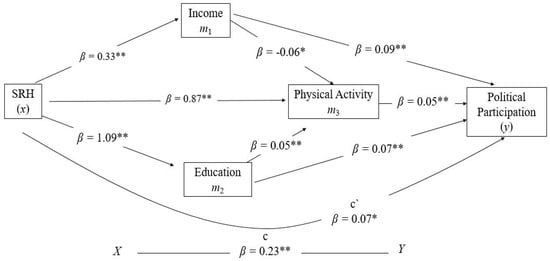 This study examined whether income, education, and PA mediated the relationship between SRH and PP of voters and non-voters aged 50 years and over from 20 European countries. The results revealed small, negative, and significant correlations between income, education, PA, SRH, and PP with age and sex. The inverse relationship was higher among men. In turn, income, education, PA, SRH, vote, and PP correlated slightly [], positively, and significantly, suggesting the ability to enhance each other. Income and education are indicators of social class and can intersect with health, reducing or increasing PP []. Income is also associated with years of education [], which can influence an individual’s political interest and engagement []. Thus, the lower the social class, the greater the tendency for the individual to achieve fewer years of schooling, followed by a greater likelihood of health problems and consequent low PP.