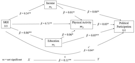 According to Mattila et al. [], poor health suppressed turnout, which was partially mediated by social connection. Based on these findings, it is possible to assume that with adequate levels of PA, an older individual can maintain and expand a social network, which, in turn, can promote electoral participation. To our knowledge, no study has explored associations between PA and PP of voters and non-voters in a national election in Europe. Thus, the present study examined the mediating role of income, education and PA in the relationship between SRH and PP of European voters and non-voters aged 50 and over.