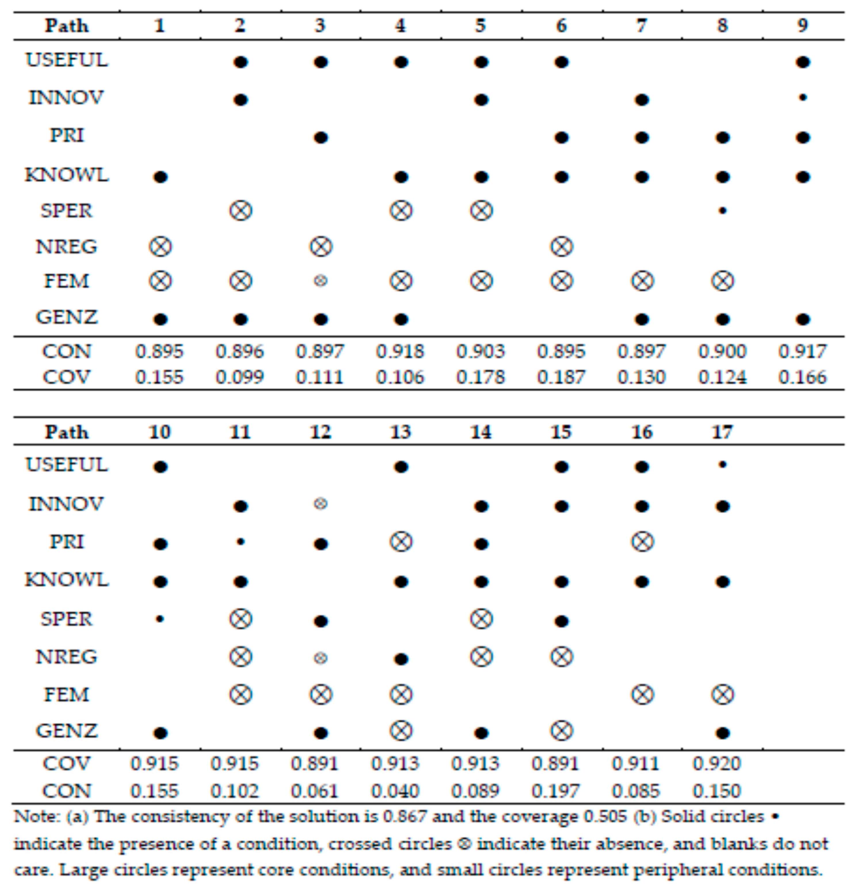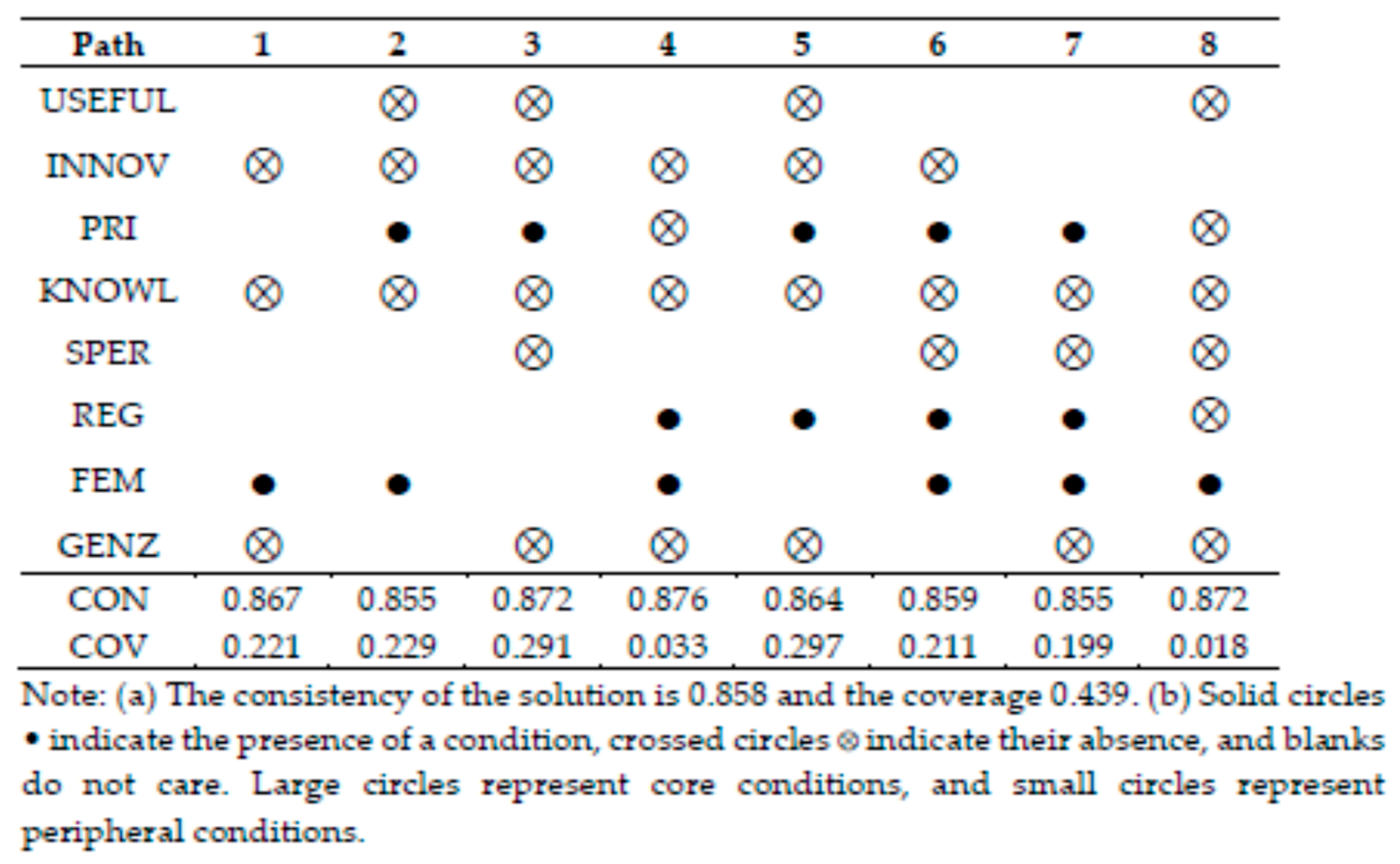 - We performed an analysis of sufficient conditions. For this assessment, it is necessary to construct recipes (also referred to in the literature as prime implicates or configurations) that make up the intermediate solution (IS) and the parsimonious solution (PS) for both GAIU and ¬GAIU. These recipes are interpreted as antecedents, pathways, or profiles linked to adherence to and reluctance to GAI. Prime implications of the IS are obtained using assumptions about the presence or absence of the exogenous variables in WTR and ¬WTR, based on the hypotheses developed in Section 2.1.
