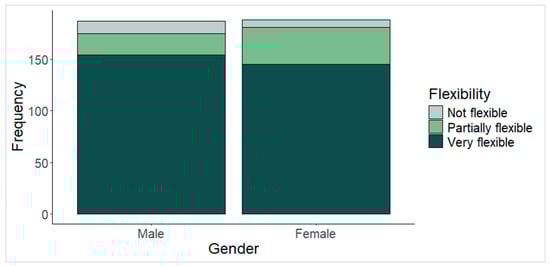 Figure 1 shows the distribution of individuals by gender, categorized by their perceived level of flexibility. Males and females each represent approximately 50% of the sample. Among females, there is a higher concentration in the “partially flexible” category compared to males. Conversely, a greater proportion of males fall into the “not flexible” category.