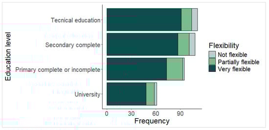 Figure 2 shows the distribution of surveyed individuals by education level. Individuals with technical education represent approximately 30% of the sample, followed by those who completed secondary education (29%) and those with complete or incomplete primary education (25%). The distribution of individuals in the “very flexible” category is relatively uniform across all education levels. However, the technical and secondary education groups exhibit a higher concentration of individuals who perceive their flexibility as “not flexible,” compared to those with primary or undergraduate education.