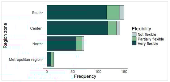 Most individuals are concentrated in the southern and central regions of Chile, accounting for approximately 80% of the sample, as shown in Figure 4. The northern region represents 37% of the data, while the Metropolitan Region accounts for about 4%. The southern region shows a higher concentration of individuals reporting a “not flexible” level, and it also has the highest concentration of individuals in the “partially flexible” category.