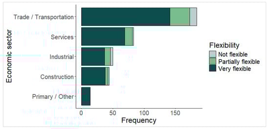 Distribution of individuals per economic sector with the perceived flexibility in the stacked bars.