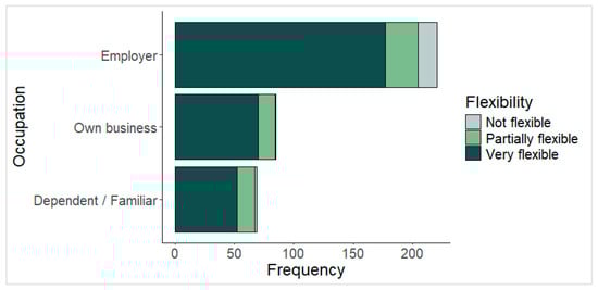 Figure 6 shows the distribution of individuals by occupation. Half of the responses come from individuals in the “Employer” category, while “Own Business” accounts for 23%, and “Dependent/Familiar” represents 18% of the sample. The distribution of flexibility levels is similar for the “Own Business” and “Dependent/Familiar” categories, whereas the “Employer” category shows a higher concentration of individuals reporting a “Not Flexible” level.