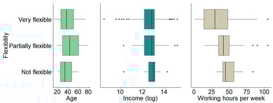 Figure 7 presents the distribution of numerical features across perceived flexibility levels using boxplots for each category. In terms of age, individuals who perceive their flexibility as “partially flexible” tend to be older than those in the other two categories. Income levels do not show substantial differences in central tendency; however, the spread of income is wider among individuals who perceive their work as “very flexible.” Finally, working hours per week follow a clear trend: as weekly hours increase, the perceived level of flexibility tends to decrease.