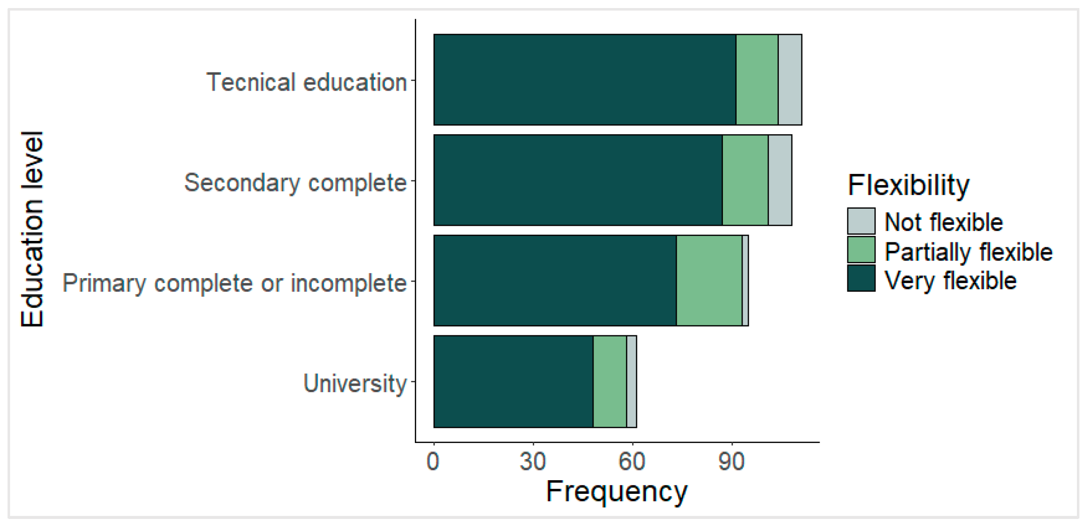 Figure 2. Distribution of responses by education level with stacked bars for perceived flexibility.