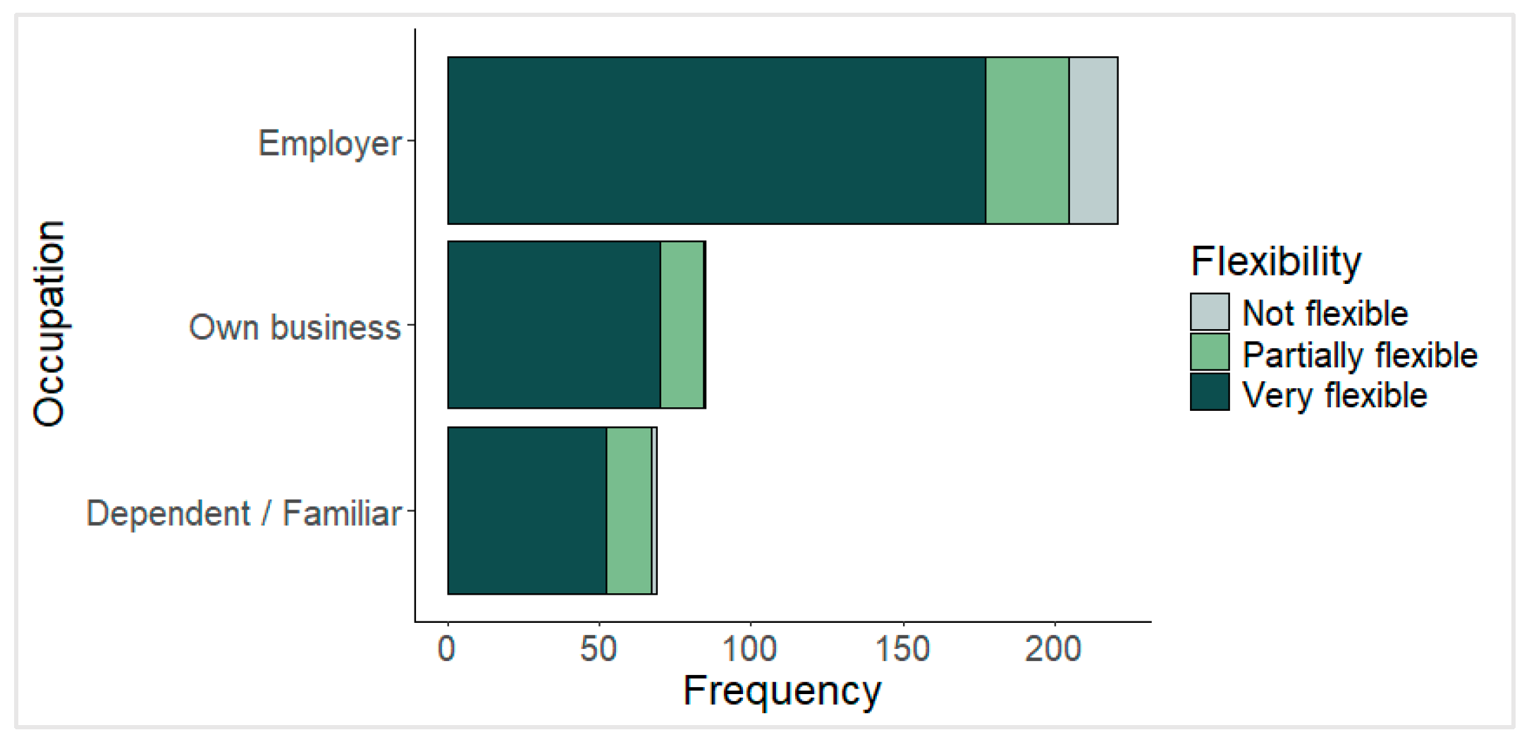 Figure 6. Occupation type of individuals with stacked bars considering the flexibility level in the responses.
