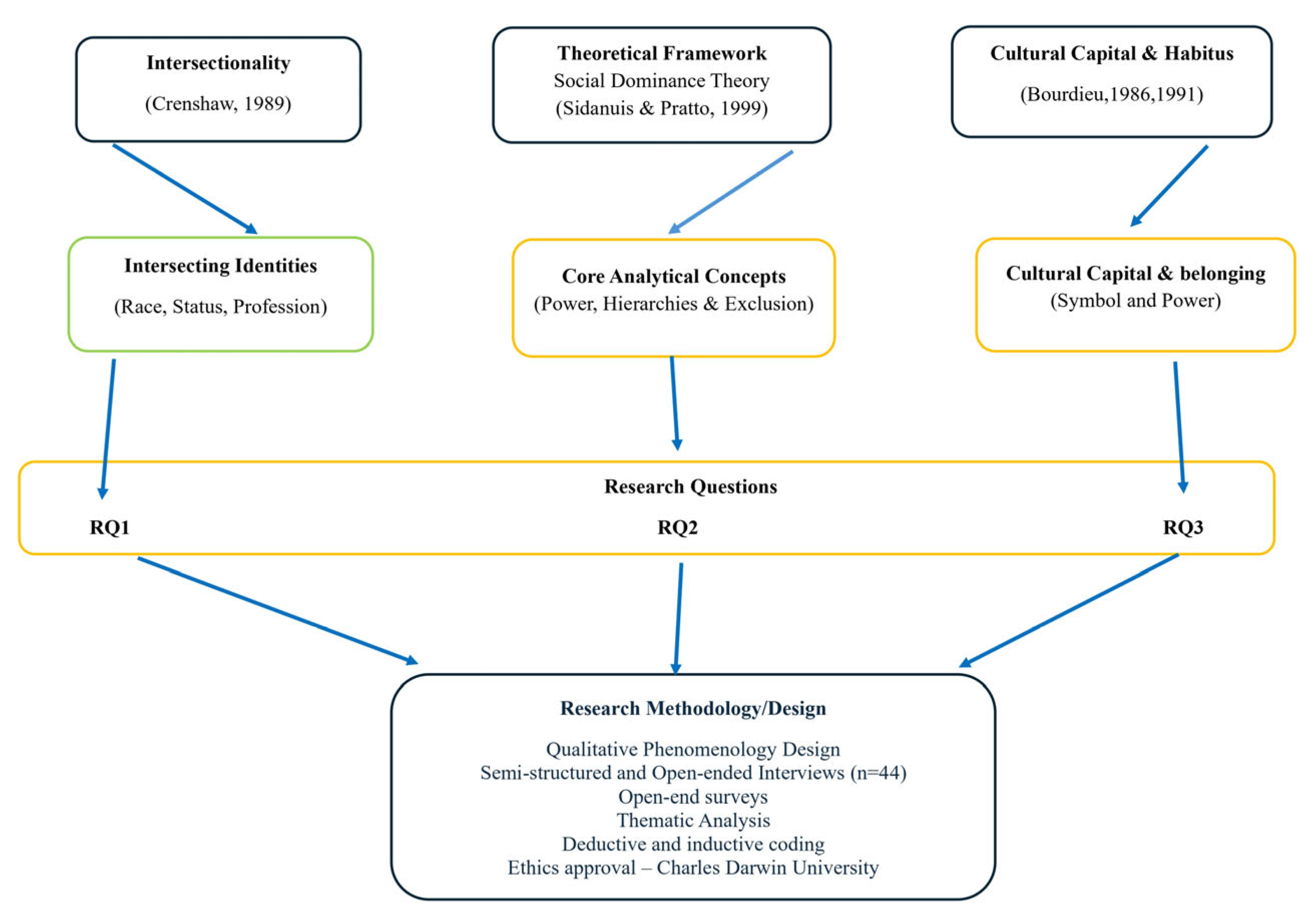 This triangulated framework enables the study to capture the structural (SDT), identity-based (Intersectionality), and cultural-symbolic (Bourdieu) dimensions of exclusion. It responds to a critical gap in migration research by offering a theoretically grounded, empirically informed analysis of inter-migrant power relations—a phenomenon often overshadowed in studies of multiculturalism and workplace integration. As such, the framework advances current theoretical debates while providing analytical tools for understanding the multi-layered nature of exclusion in diverse professional settings.