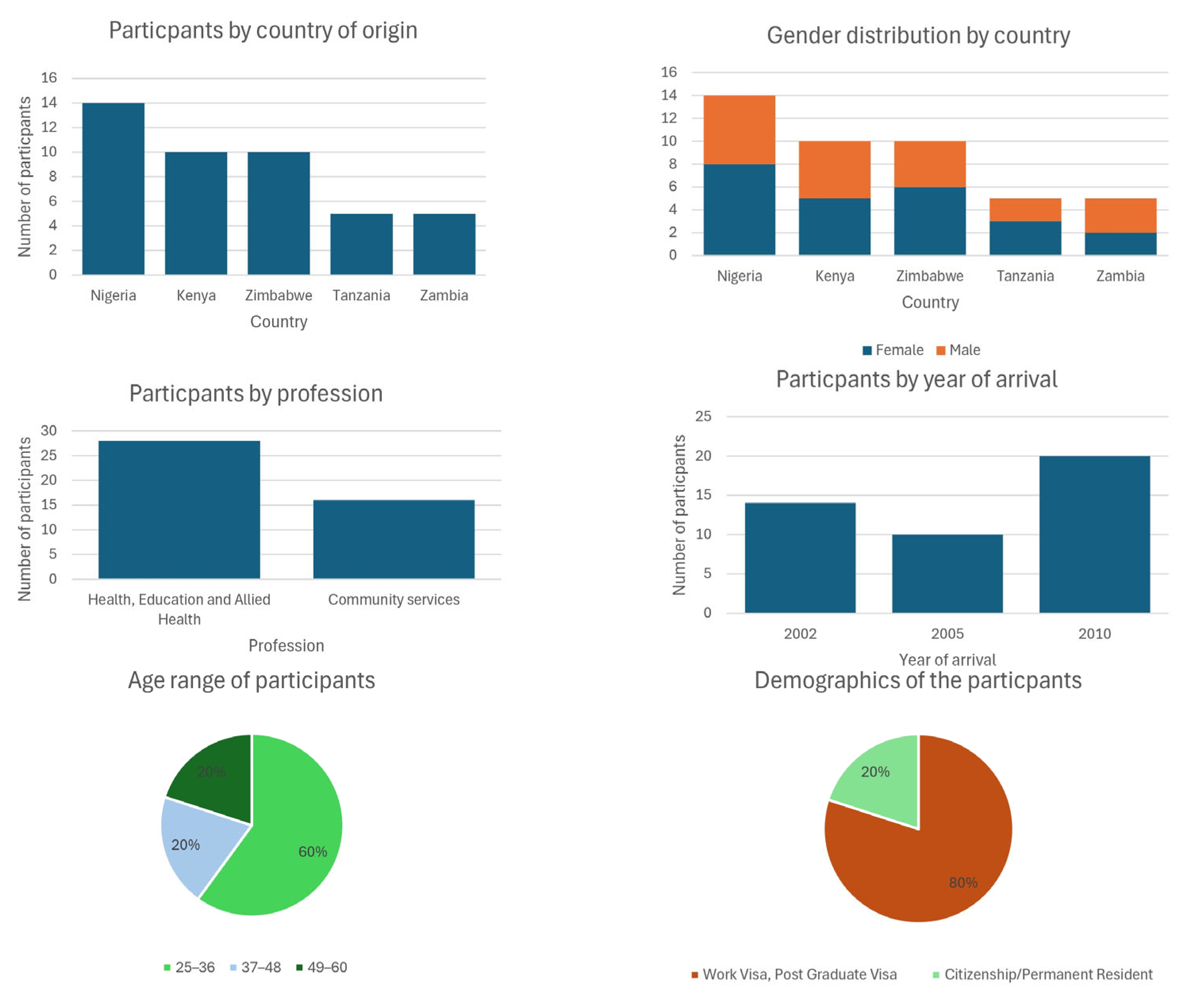 The demographic profile reflects both diversity and representativeness in relation to the study’s focus on intersectionality. National groups included Nigerian (n = 14), Kenyan (n = 10), Zimbabwean (n = 10), Tanzanian (n = 5), and Zambian (n = 5) professionals, most of whom were employed in skilled professions within education, health, and community services. Participants ranged in age from 25 to 60 years, with both younger early-career professionals and established mid- to late-career migrants represented. Gender distribution was relatively balanced (25 females and 19 males), although there were slight variations across national groups.