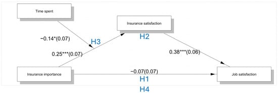In accordance with statistical practices prevalent in the field of management, we classified all ordinal variables as continuous for the purposes of our regression analyses. We employed “Structural equation modeling (SEM)” in Stata to examine the associations in our model. Firstly, to test the mediation effect between Insurance Importance (independent variable) and Job Satisfaction (dependent variable), Job Satisfaction was regressed on the mediator variable (Insurance Satisfaction), Insurance Importance, and covariates, and then Insurance Satisfaction was regressed on Insurance Importance and covariates. We employed “medsem” package to further to conduct mediational analysis []. Secondly, Insurance Satisfaction was regressed on Insurance Importance, the interaction term (Insurance Importance * Time Spent), and covariates. Upon establishing the presence of both mediation and moderation effects, we proceeded to concurrently assess all associations in an integrated model using the PROCESS Macro Model 7 package in SPSS, developed by Hayes [].