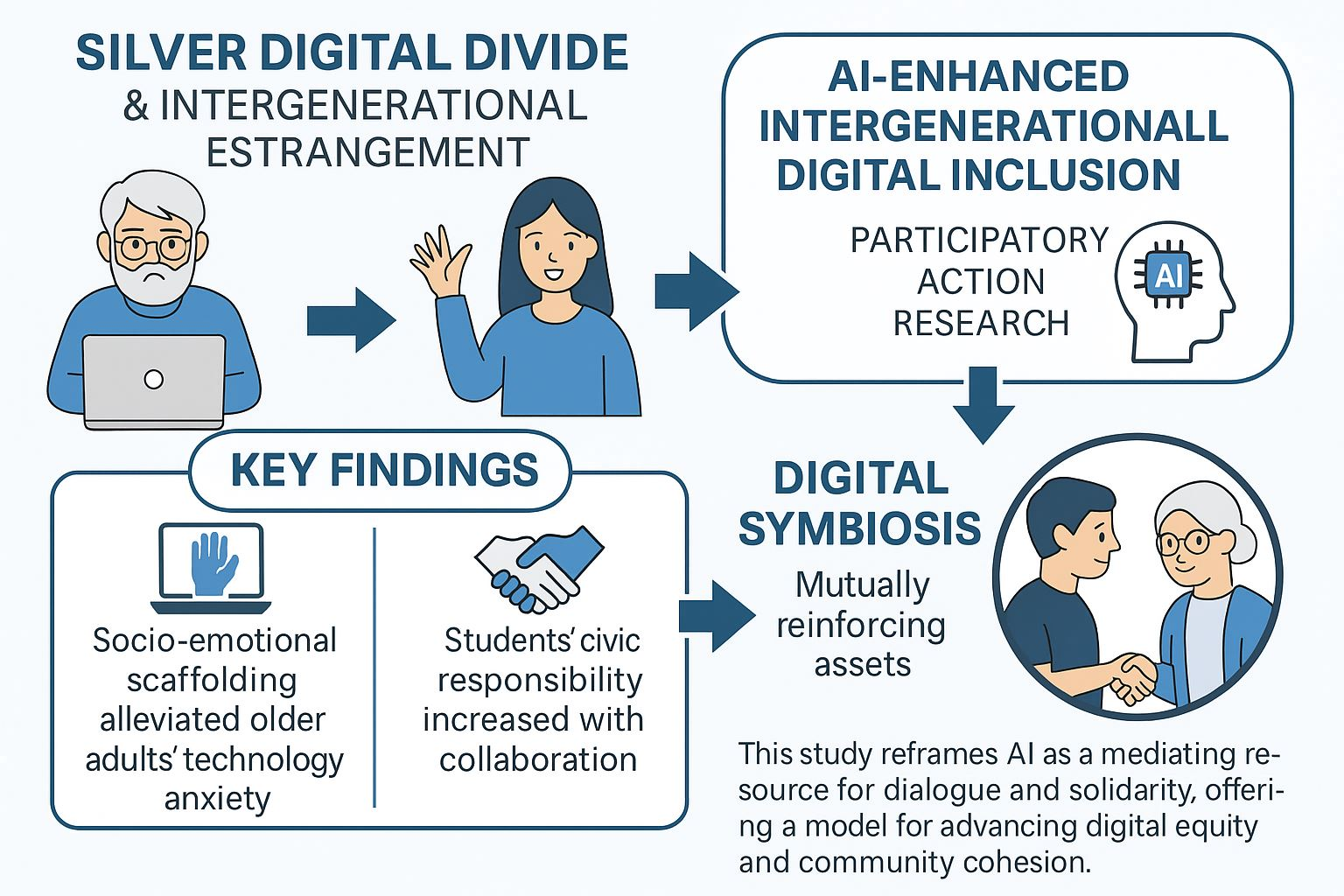 This study was initiated to address the dual sociological challenges of the “silver digital divide” and “intergenerational social distance” within the contemporary context of population aging and the rise of artificial intelligence. Using a Participatory Action Research design, the study proposed and empirically validated the AI-Enhanced Intergenerational Digital Inclusion (AI-IDI) framework, an integrative model situated at the intersection of education, community engagement, and digital equity. The findings confirmed that socio-emotional scaffolding functions as a critical mechanism of success and provided comprehensive answers to the four guiding research questions: the mechanisms of intergenerational co-learning (RQ1), its implications for digital equity (RQ2), the pedagogical role of AI (RQ3), and the overall effectiveness of the framework (RQ4).