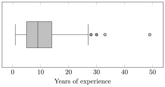 The distribution of teaching experience, illustrated in Figure 1 by a box-and-whisker diagram, shows a positive asymmetric structure with outliers. This pattern reflects a predominant concentration in the first decade of teaching, with a smaller subgroup of academics whose careers extend significantly, reaching up to almost five decades of professional experience.