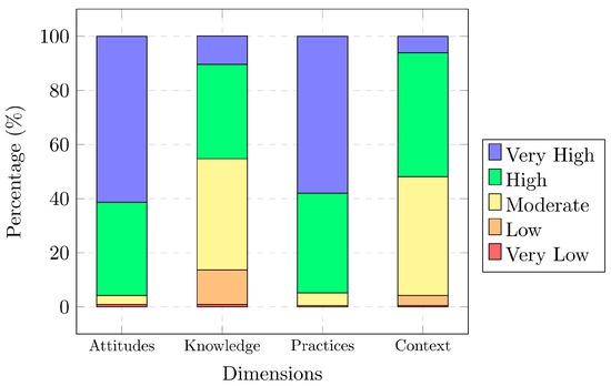 The analysis of the four dimensions assessed revealed distinct distribution patterns (Figure 2). The attitude dimension showed a marked tendency towards higher levels, with a significant concentration in the categories “Very High” (61.32%) and “High” (34.43%), accumulating 95.75% of the responses. This distribution suggests a remarkably positive disposition of teachers towards inclusive education. The knowledge dimension presented a more heterogeneous distribution, being mainly concentrated in the “Moderate” (41.04%) and “High” (34.91%) levels. Although 45.29% of the participants reached higher levels (“High” and “Very High”), a considerable proportion was observed at the “Low” level (12.74%), indicating opportunities for improvement in teacher training.