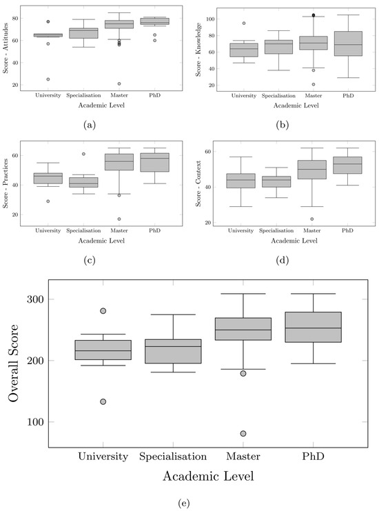 Figure 3 shows the distribution of scores according to the academic level of the participants. Teachers with master’s and doctoral degrees obtained higher scores and showed less variability in their responses compared to the undergraduate and specialisation levels, with this trend being more evident in the dimensions of practice and context. The total score exhibited an ascending pattern from undergraduate to doctoral level, with less dispersion at higher academic levels, suggesting a trend towards more consistent responses as the level of education increases.