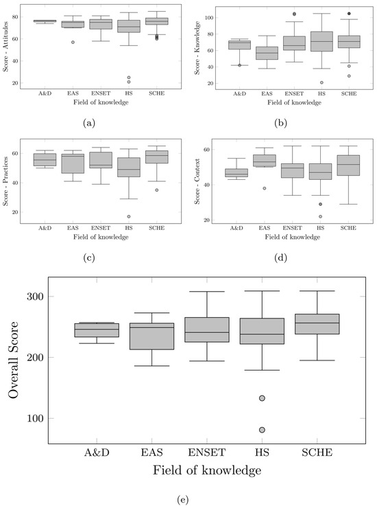 Distribution of scores on the dimensions of educational inclusion, (a) Attitudes, (b) Knowledgs, (c) Practices, (d) Context, and (e) Overall, and total score according to teachers’ area of knowledge. A&D: Arts and Design, EAS: Economic and Administrative Sciences, ENSET: Exact, Natural Sciences, Engineering and Technology, HS: Health Sciences, SCHE: Social Sciences, Humanities and Education.