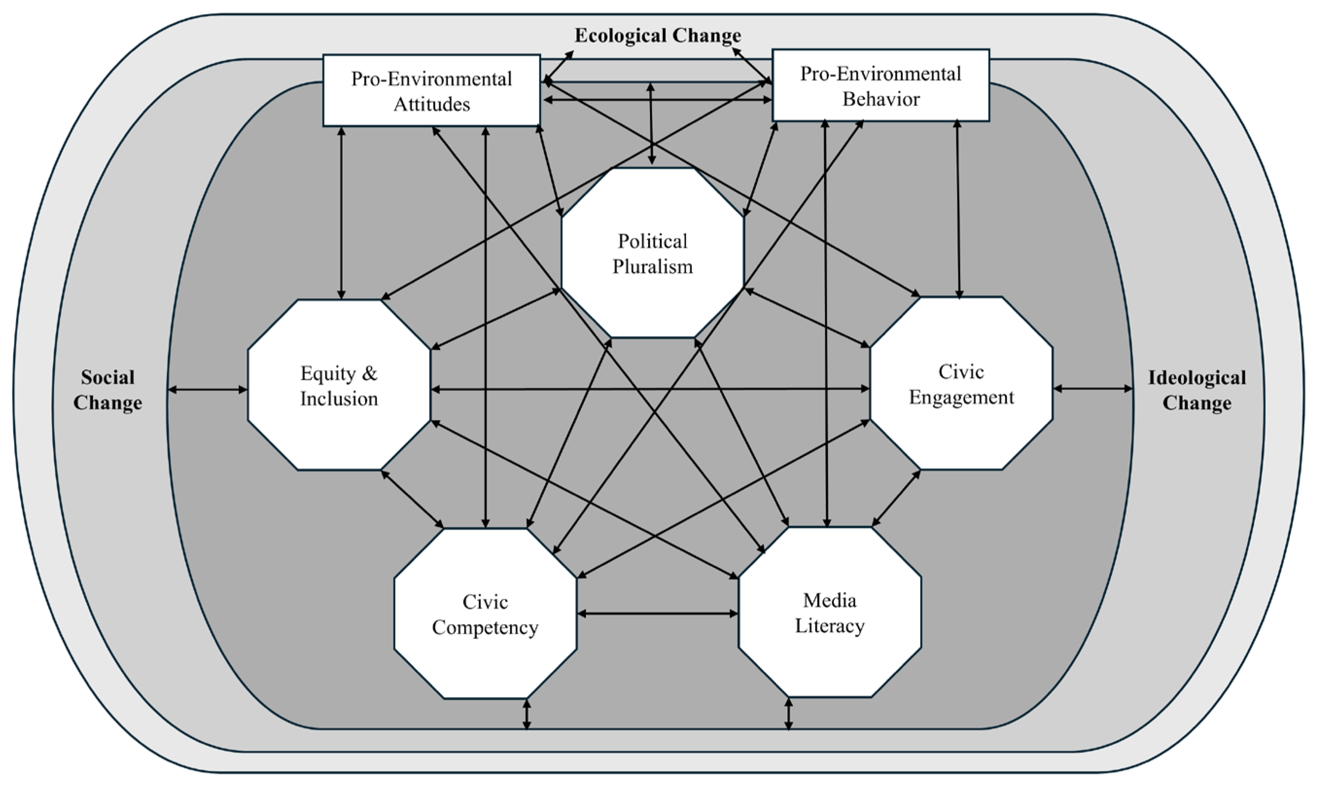 - Ardoin, N.M.; Bowers, A.W.; Gaillard, E. A systematic mixed studies review of civic engagement outcomes in environmental education. Environ. Educ. Res. 2023, 29, 1–26. [Google Scholar] [CrossRef]