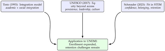 From a Latin American perspective, Ortiz-Martínez et al. [13] demonstrate that structural and cultural barriers remain central determinants of retention in STEM programs, particularly for women in public universities. These findings align with López-Aguirre and Farías [14], who argue that persistent gender gaps in scientific productivity are not only a matter of access, but also the result of systemic inequities that constrain women’s academic progression. Incorporating these regional perspectives, this study interprets the case of UNEMI as emblematic of broader structural challenges in Latin America, where inclusive policies must be complemented by deeper cultural and institutional reforms to achieve sustainable gender equity in engineering education.