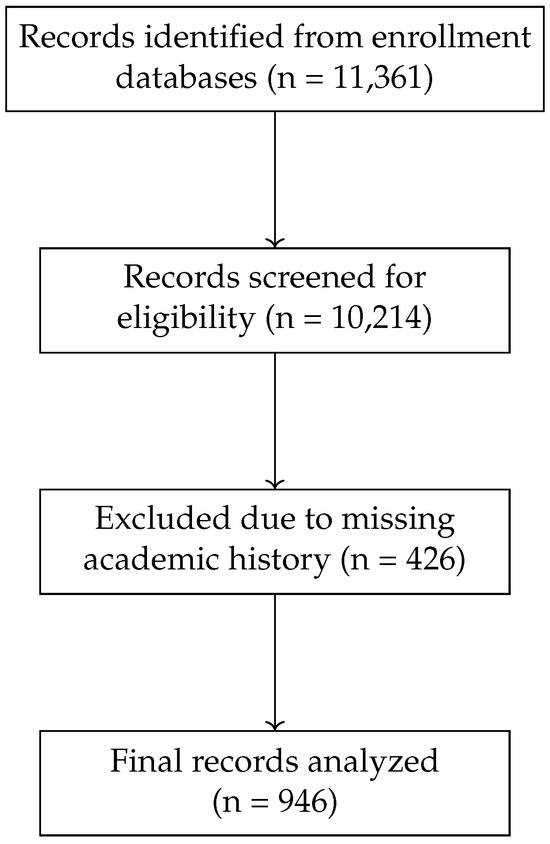 Although the study is not a systematic review, the selection of institutional records for enrollment and performance followed a transparent procedure inspired by the PRISMA flow model. This approach enhanced the traceability of the dataset used for the final analysis and is illustrated in Figure 3.