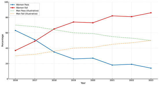 The analysis of academic performance reveals a steady decline in the pass rate among female students. As shown in Figure 4, the approval rate dropped from 63% in 2016 to just 14% in 2023. Although a similar trend was observed among male students, their performance remained slightly higher throughout the period. For illustrative purposes, male pass rates are estimated to have decreased from 72% in 2016 to 30% in 2023. These estimates are consistent with the narrative of declining persistence across genders reported in institutional records, even though the primary analysis of this study focused on female students.