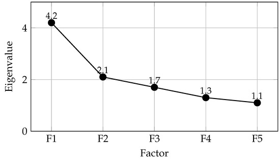 The statistical analysis was performed using a combination of Microsoft Excel and the open-source statistical platform Jamovi (version 2.3.21). Prior to the factor extraction process, the adequacy of the dataset was verified through standard preliminary tests. Bartlett’s test of sphericity yielded a statistically significant result ( = 5000, = 105, ), confirming that the correlation matrix was appropriate for factor analysis. Additionally, the Kaiser–Meyer–Olkin (KMO) measure of sampling adequacy was 0.82, which is considered “meritorious” according to commonly accepted thresholds.