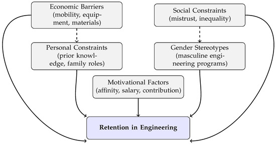 Critical perspectives on gender and education emphasize the influence of stereotypes and structural barriers in limiting participation in technical disciplines [7,14]. These theories argue that gender equity requires transforming both institutional frameworks and cultural narratives about who belongs in engineering and scientific domains. This study draws upon these conceptual models to understand how economic, social, motivational, and personal factors interact to shape female student retention—relationships that are visually summarized in Figure 2 and Table 2.