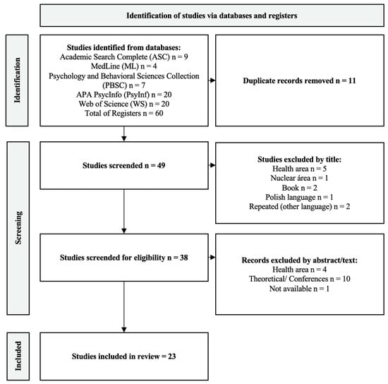 As shown in Figure 2, we identified 60 articles. The Academic Search Complete (ASC) database contributed nine articles, MedLine (ML) provided four articles, Psychology and Behavioral Sciences Collection (PBSC) identified 7, PsycINFO (PINF) presented 20 articles, and Web of Science (WS) provided 20 articles. However, we observed the duplication of 11 papers, resulting in the analysis of 49 articles. In an initial analysis of titles and abstracts, we excluded 11 articles. We then assessed the full texts of the remaining 38 articles. After this initial exploration, 15 studies were excluded because they did not meet the inclusion criteria, resulting in an analysis corpus of 23 studies in this systematic review (see Figure 2 for details).