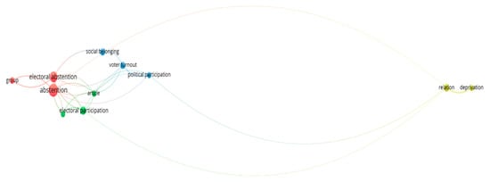 Figure 4 presents a neural network analysis developed to synthesize the content of the 23 studies reviewed. The network was constructed using topic modeling techniques, representing thematic clusters derived from the key terms and concepts identified in the studies. The edges indicate the strength of co-occurrence or thematic similarity, measured by similarity metrics. The visualization was performed using VOSviewer software v1.6.20. The interpretation focuses on identifying central themes (e.g., social belonging) and their interconnections, and on elucidating the multidimensional factors underlying electoral abstention.