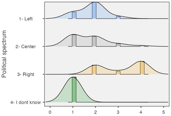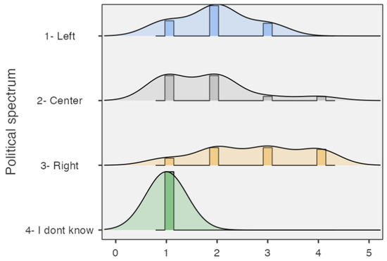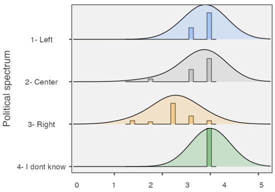 We used the Kruskal–Wallis test to compare the medians of more than two groups because it is a non-parametric test. You can find the specifics in Table 3. If a p-value is less than 0.001 (p; 0.001) for an analyzed statement, it tells us that there are real differences between the political groups.