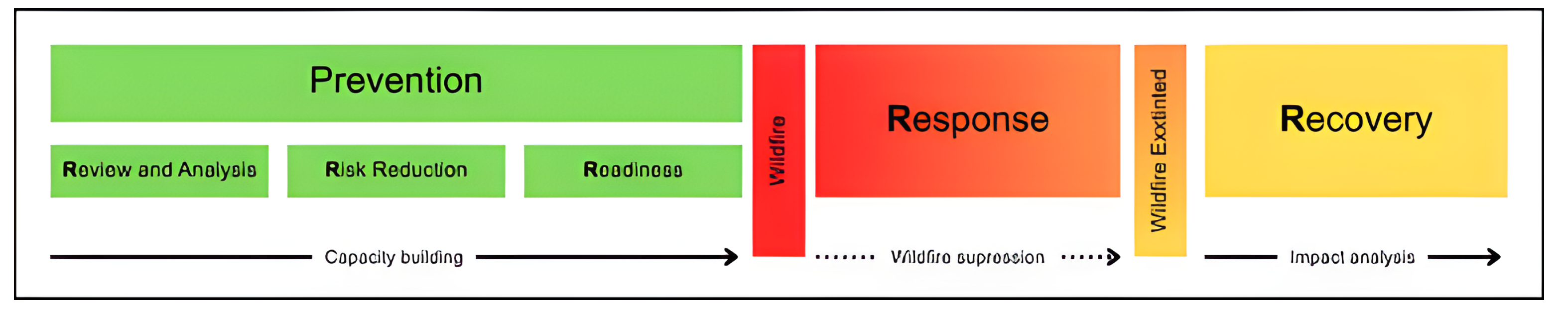 Three temporal phases were identified in the analysis of news coverage, corresponding to the stages of the wildfire management cycle, prevention, response, and recovery according to the 5Rs in wildfire management [