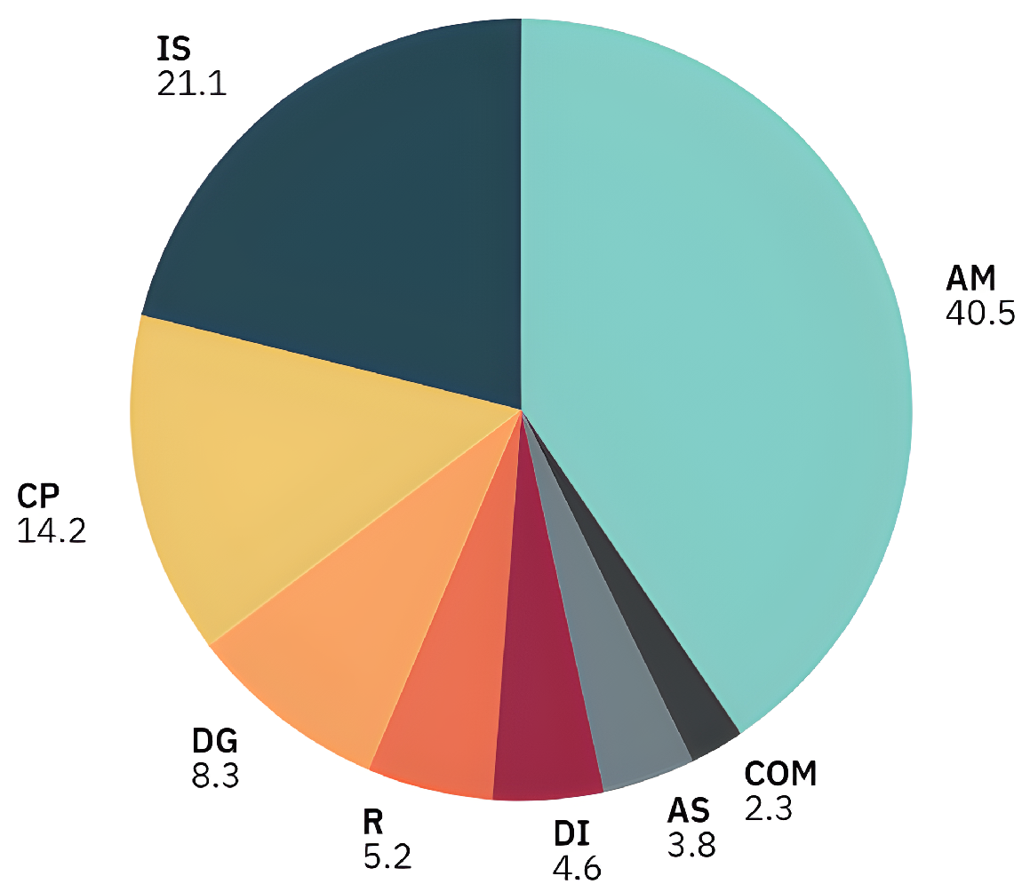 The categorization of publications reveals a predominance of social representations related to environmental impact (40.5%), followed by social and community impact (21.1%), demonstrating a clear tendency to emphasize wildfire effects on biodiversity and communities. In contrast, representations associated with firefighting efforts (2.3%) and social actors (3.8%) are the least frequent. The complete distribution of publications by category is presented in