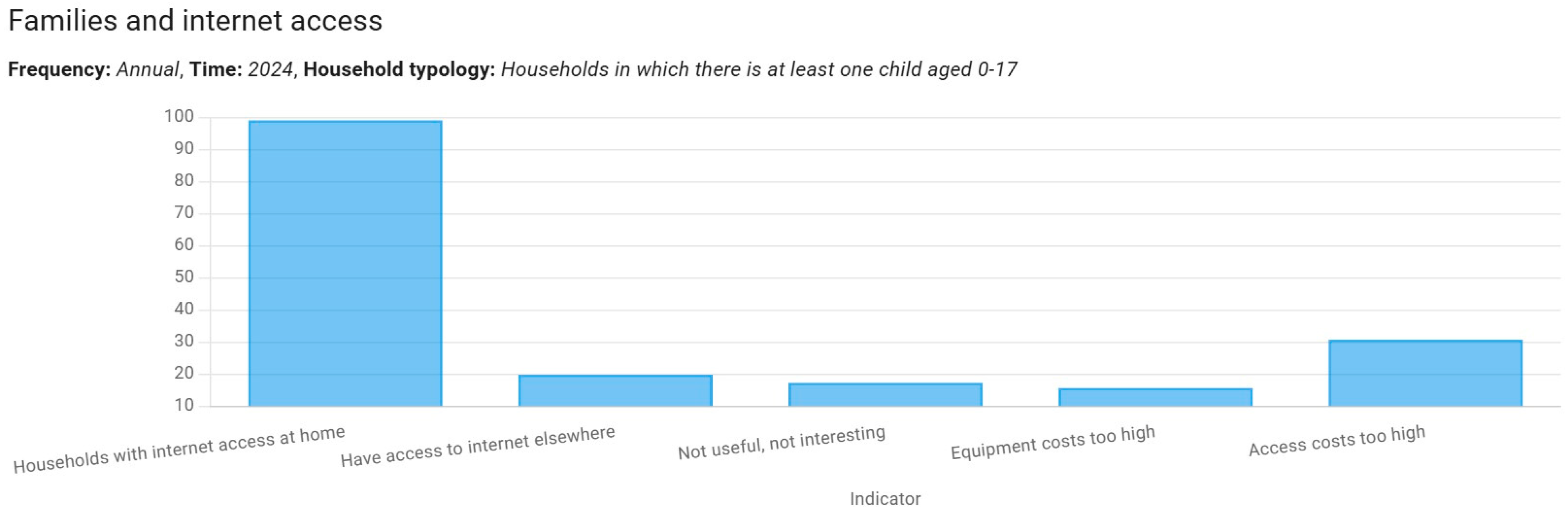 12]. According to ISTAT data (2024), almost all households with at least one minor are now connected to the Internet, yet regional disparities persist, particularly between northern and southern regions, alongside differences associated with parents’ educational attainment and occupational status. Connectivity thus follows existing social hierarchies rather than overcoming them, indicating that the expansion of access alone does not guarantee equality of participation.