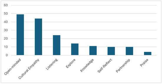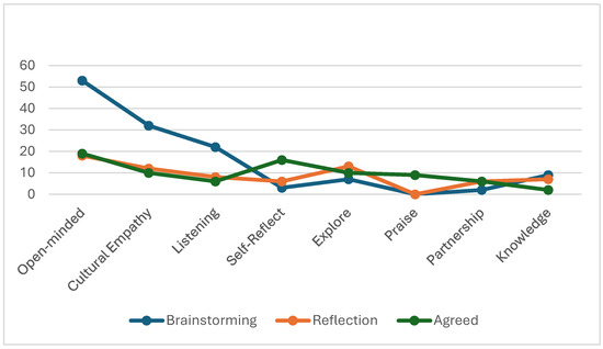 The findings indicated that during the “brainstorming” prompt, students identified 128 behaviors or skills. During the “reflection” and “agreed” prompts, students generated 118 and 99 behaviors or skills, respectively. In total, students mentioned 345 behaviors or skills. Many of these were repeated by different students, while some students contributed multiple responses. Examples include: be open-minded, listen, avoid stereotyping, show empathy, be patient, be flexible, etc.