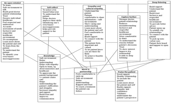 Beyond these overarching principles, our thematic network revealed three important patterns. First, the core diversity and cultural competencies identified are not isolated skills to be learned and practiced independently; rather, they are interconnected. For example, “Be open-minded” is directly linked with “Deep listening” because open-mindedness helps healthcare professionals pay closer attention to their patients. It is also linked with “Self-reflect,” as open-mindedness facilitates better understanding of oneself. “Explore further” links with “Deep listening”, “Praise the patient”, “Work in partnership”, etc. These links between competencies are detailed in Figure 3.