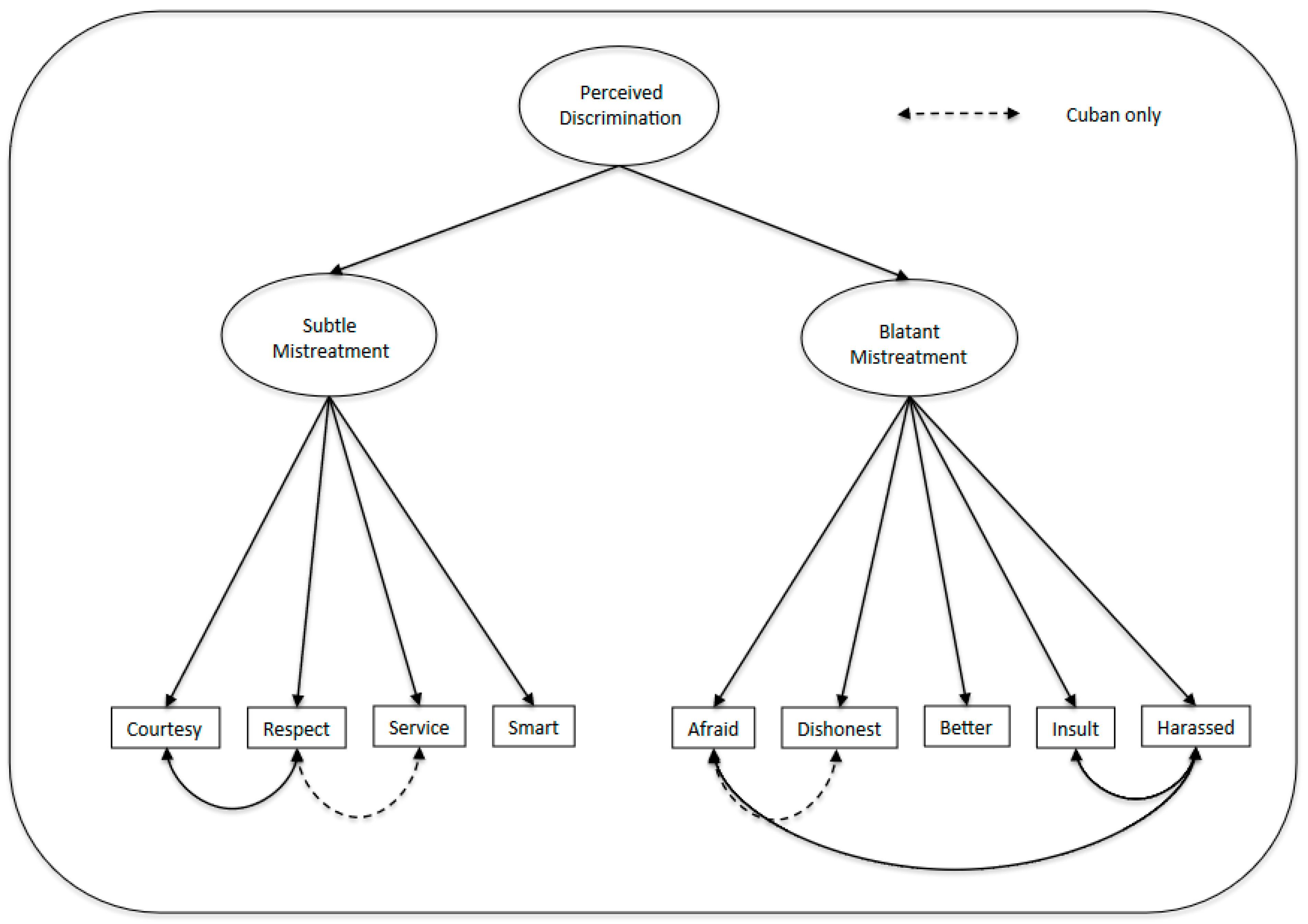 - López-Cevallos, D.F.; Harvey, S.M. Psychometric Properties of a Healthcare Discrimination Scale Among Young-Adult Latinos. J. Racial Ethn. Health Disparities 2019, 6, 618–624. [Google Scholar] [CrossRef]