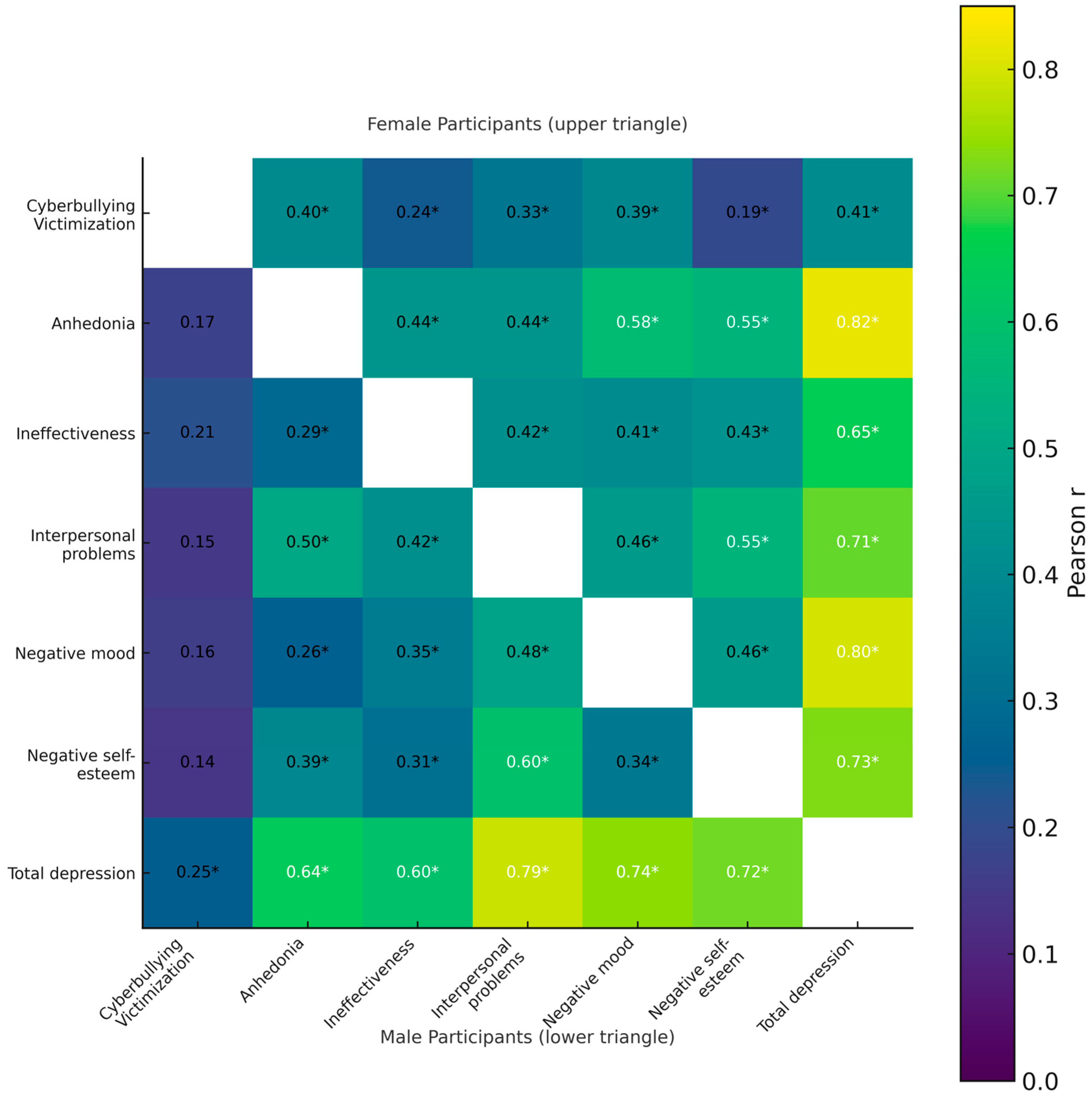 14]. The correlation map clarifies this pattern: for girls, CBV aligns broadly with negative mood, anhedonia, perceived ineffectiveness, interpersonal strain, and negative self-evaluation; for boys, the association concentrates on the global depression score. Such gendered profiles echo evidence that symptom configurations and help-seeking pathways differ by gender during early adolescence, even under comparable exposure to stressors [
