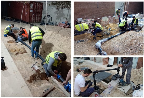 Figure 4. Different images of students performing tasks related to the assembly of drinking water connections and the assembly of a pump in collaborative projects in the outdoor workshop.