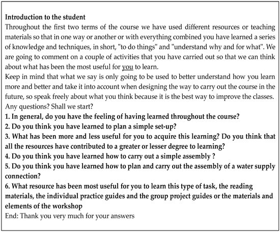 The aim of the interview was to gain a more detailed insight into the students’ perceptions and to see whether what they had previously indicated in the survey was reinforced in a relaxed atmosphere without the presence of other classmates or whether, on the contrary, they expressed views that contradicted what they had initially indicated. The script of the interview can be seen in Figure 5.